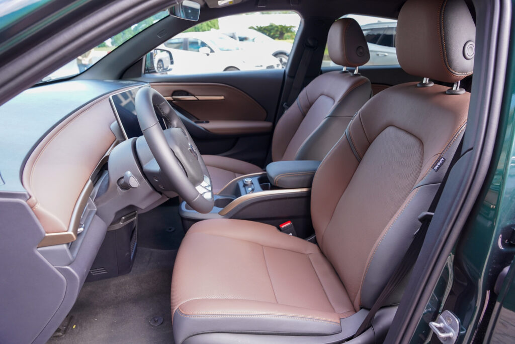 Ghế trên xe bọc da. Nhờ ưu điểm không nhiều chi tiết cơ khí phức tạp, không gian nội thất của VF 6 rộng rãi ở cả hai hàng ghế. Khoảng để chân cho hàng khách ở hàng ghế thứ hai rộng nhất phân khúc.