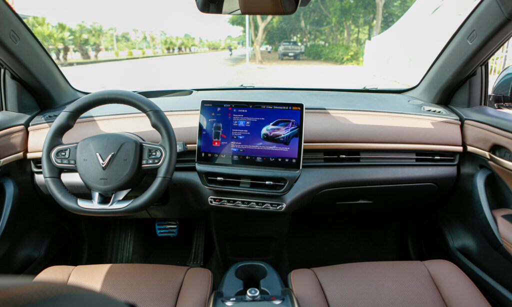 Ở nội thất, VinFast tối giản các nút bấm cho VF 6. Màn hình giải trí trung tâm kích hướng về người lái. Cần số dạng nút bấm. Xe không có đồng hồ tốc độ sau vô-lăng như hầu hết các mẫu xe trên thị trường.